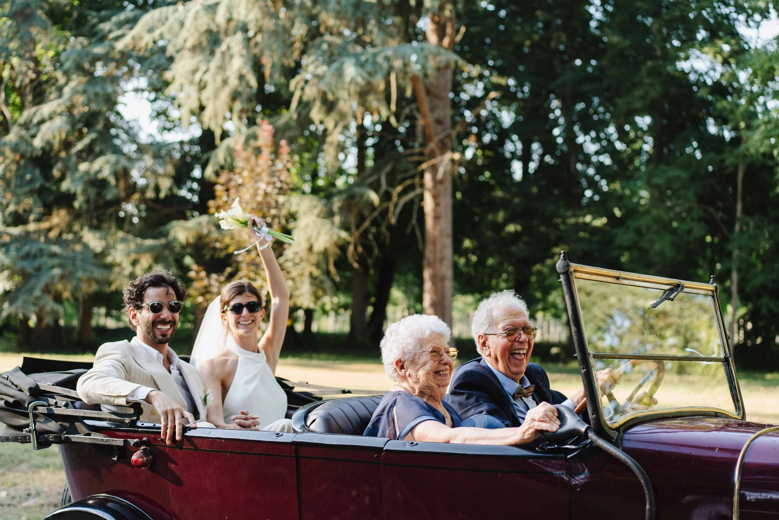 Alors que nous prenions quelques photos après la messe dans le beau jardin après la messe, il était déjà temps de se rendre au Chateau Saint Denis pour profiter d’un vin d’honneur bien mérité. Alors que les mariés prenaient la voiture ancienne pour revenir sur le lieu de réception, j’en profitais pour saisir quelques images de leur arrivée avec les grand-parents à l’avant, et les mariés derrière, cette image est peut être l’une de mes préférées de la journée, tant on lit la joie sur les visages de chacun.