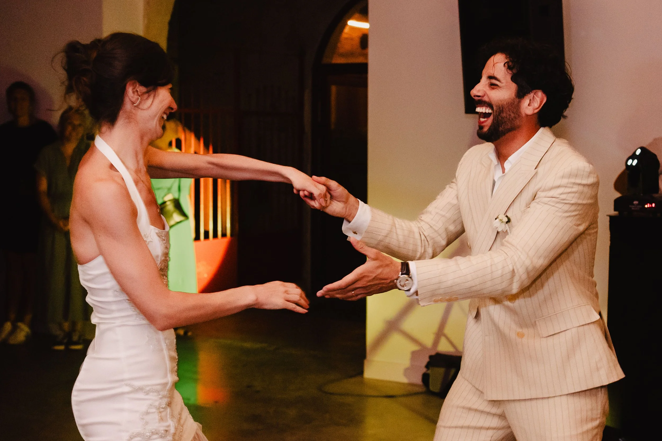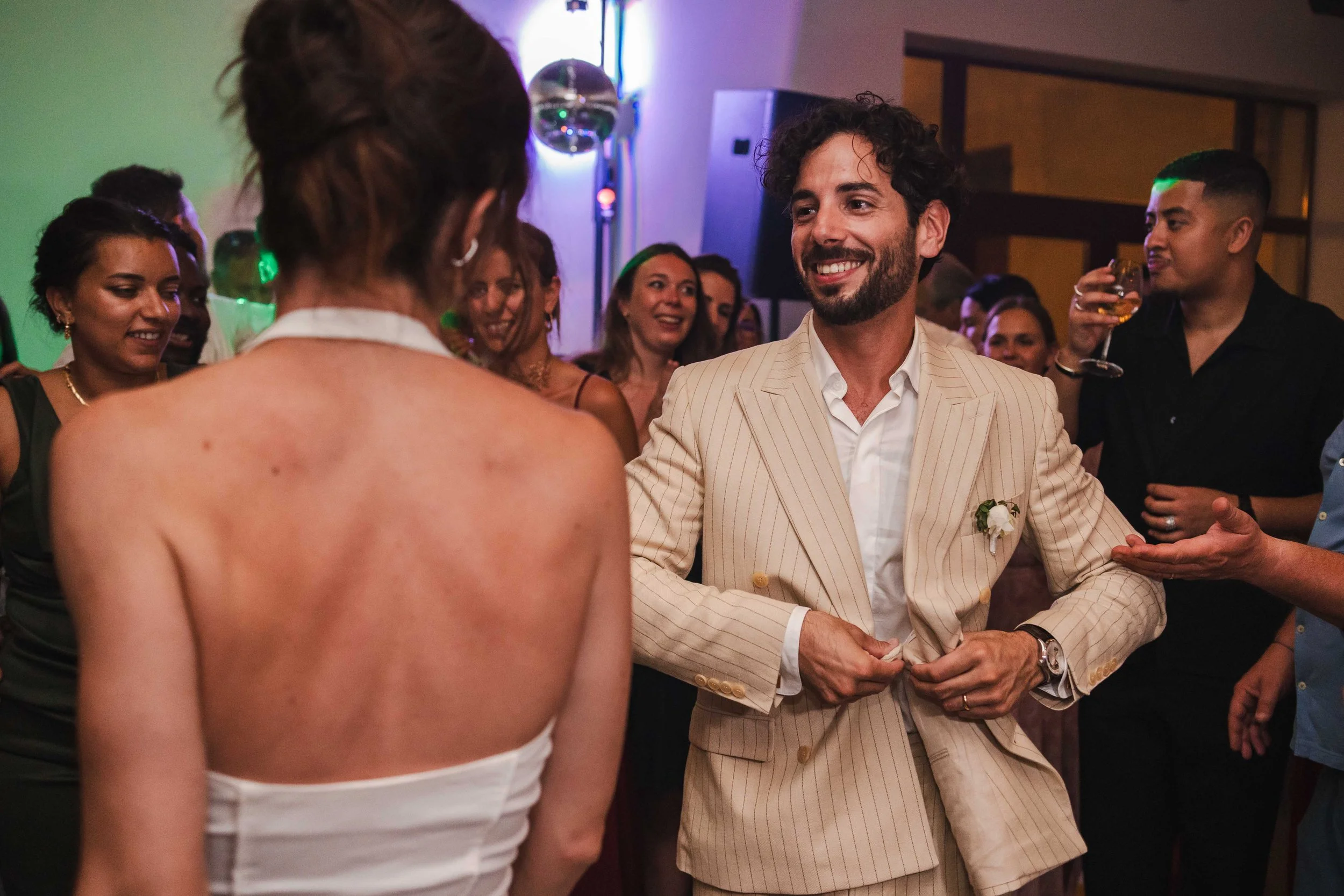Les mariés avaient à peine le temps de saluer leurs proches que la première surprise de la journée arrivait, les témoins et amis proches des mariés avaient concocté une petite chorégraphie sur la musique de 24 Magic de Bruno Mars, où ils montraient à tout le monde leurs meilleurs pas de danse, tout en envoyant dans les airs des pétales de roses, des pétales sorties de superbes bananes licorne du plus bel effet.