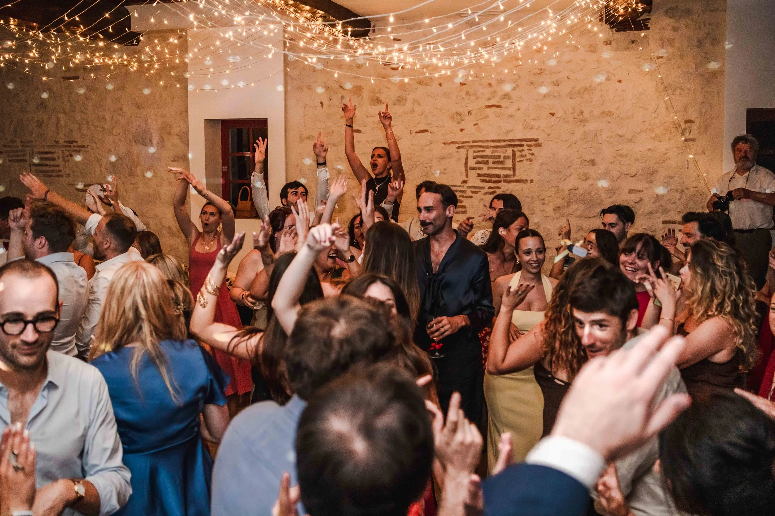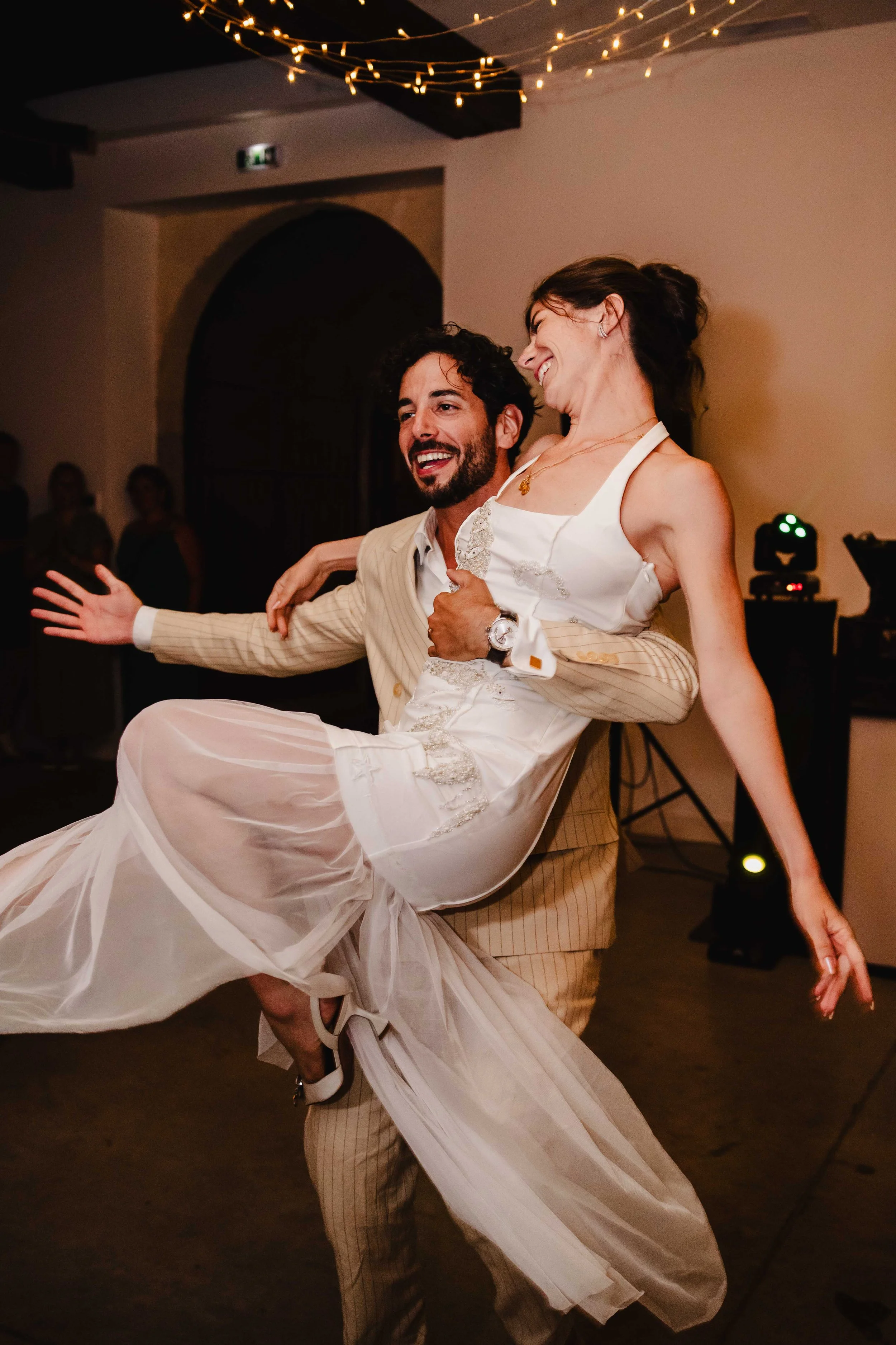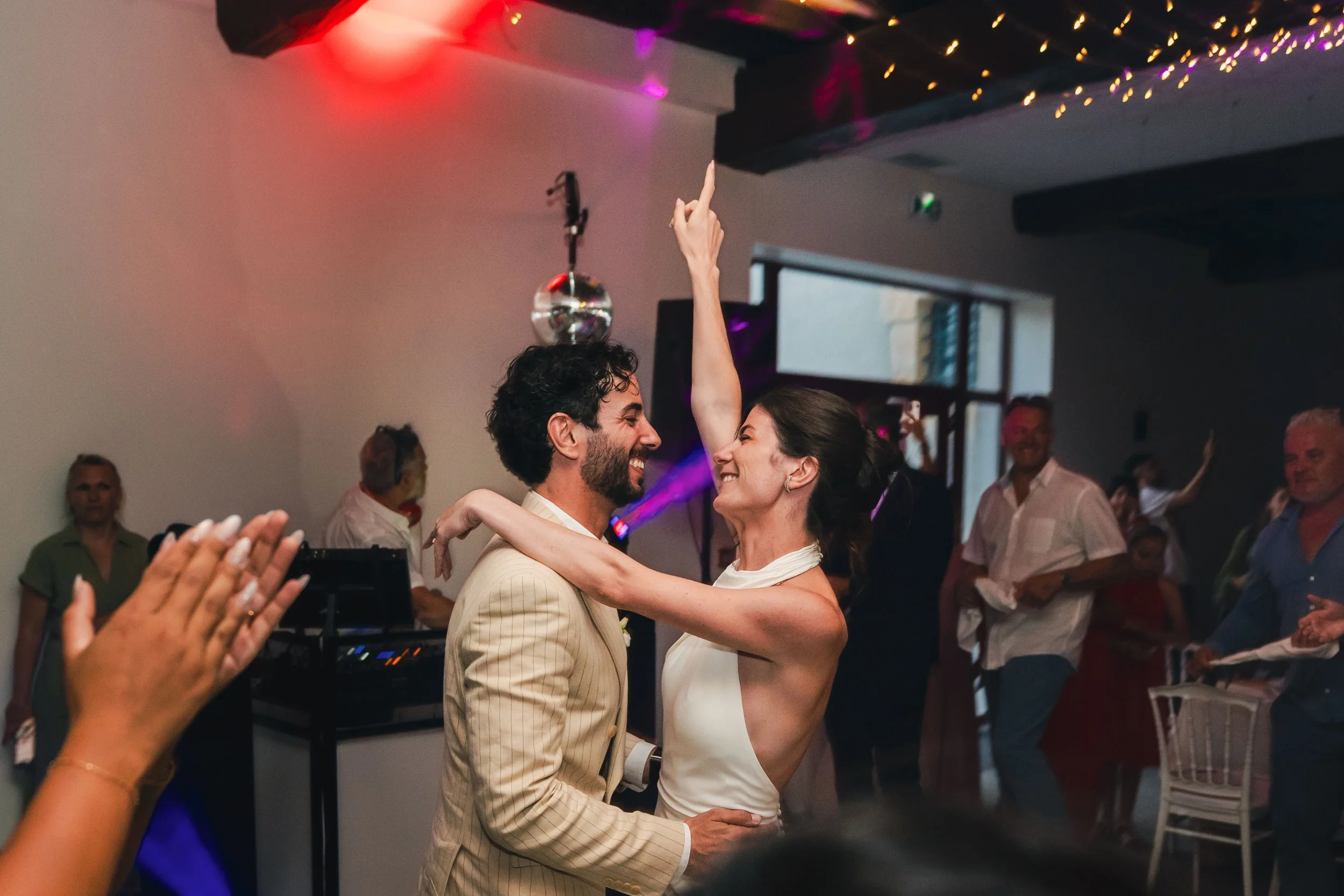 Alors que la mariée faisait sonner la cloche du domaine, les invités étaient conviés à se rendre dans la très belle salle de réception du domaine. Un ciel étoilé avec des guirlandes avait été installé et rendait l’endroit très chaleureux. Les mariés sont entrés en musique et ont mis le feu dès leur arrivée, alors que le soleil venait à peine de se coucher, cela annonçait une soirée mémorable !