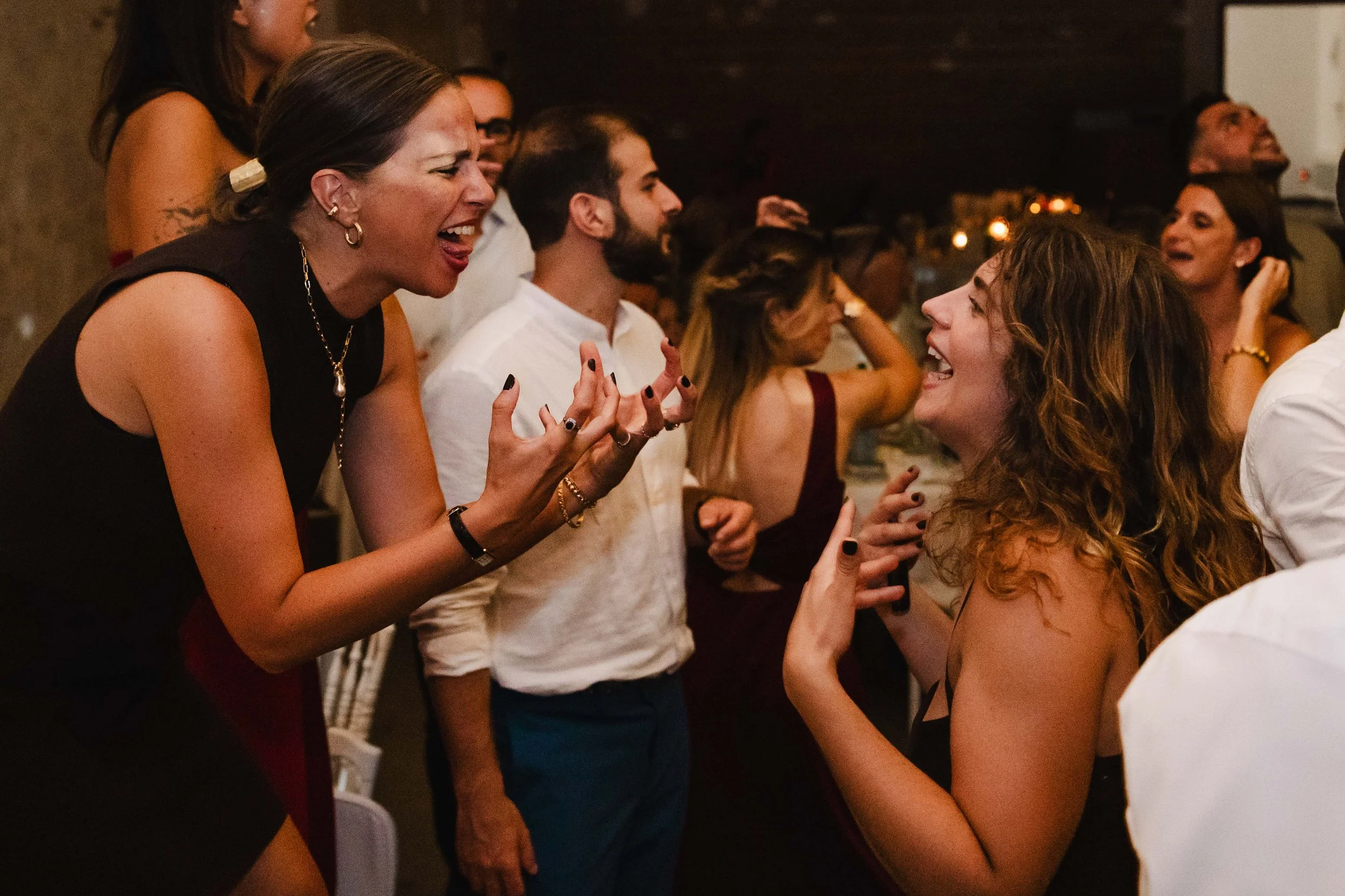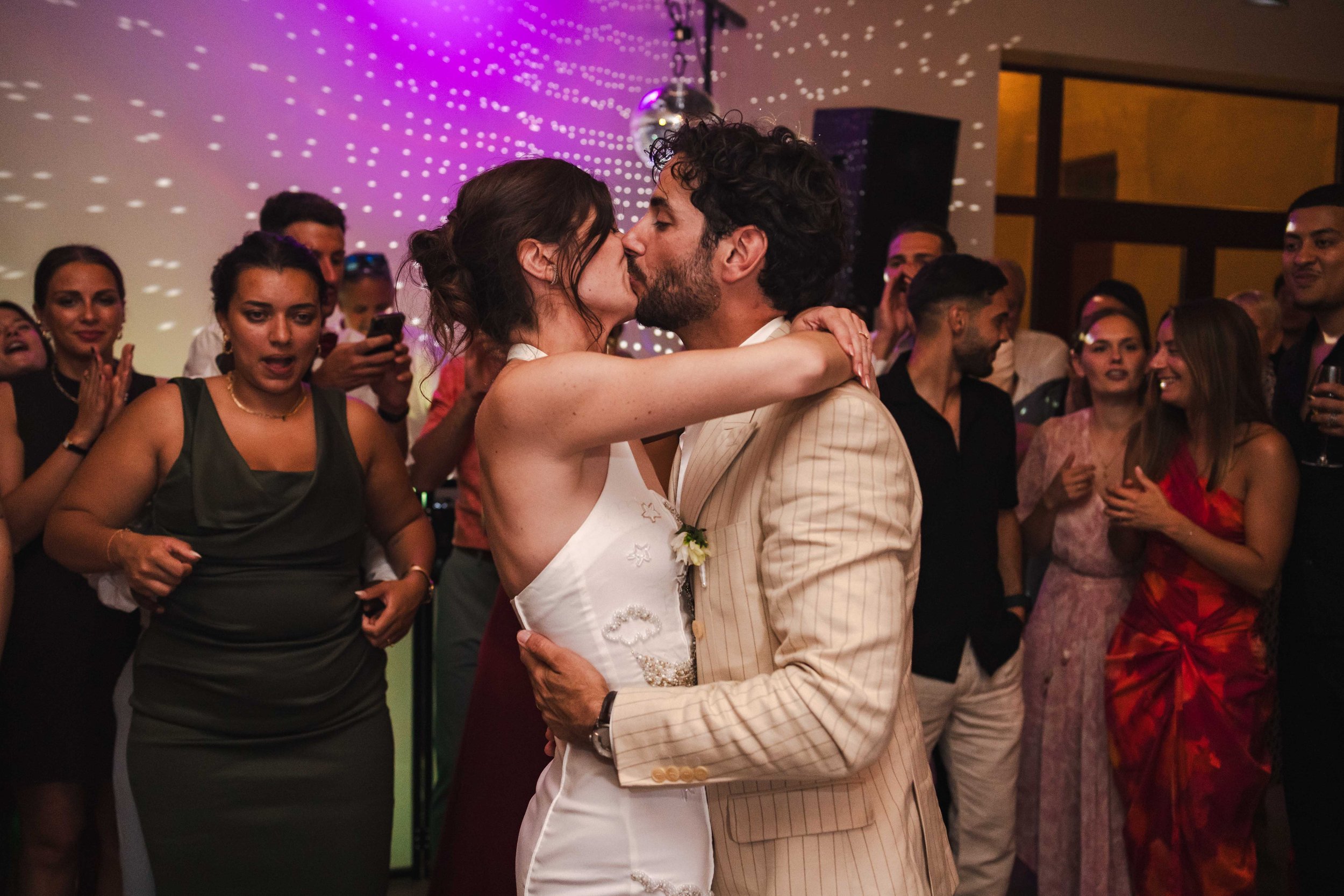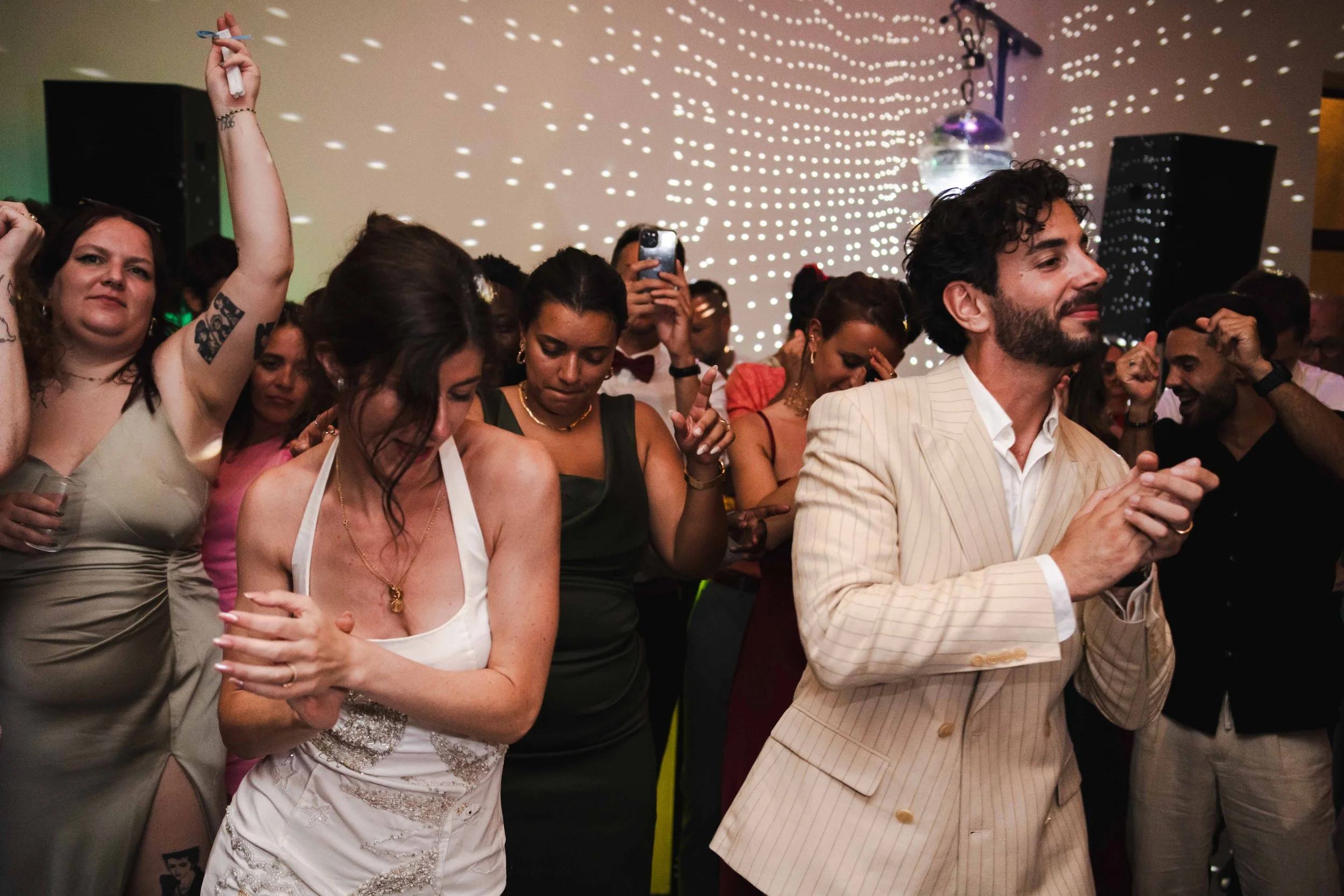 Alors que la mariée faisait sonner la cloche du domaine, les invités étaient conviés à se rendre dans la très belle salle de réception du domaine. Un ciel étoilé avec des guirlandes avait été installé et rendait l’endroit très chaleureux. Les mariés sont entrés en musique et ont mis le feu dès leur arrivée, alors que le soleil venait à peine de se coucher, cela annonçait une soirée mémorable !