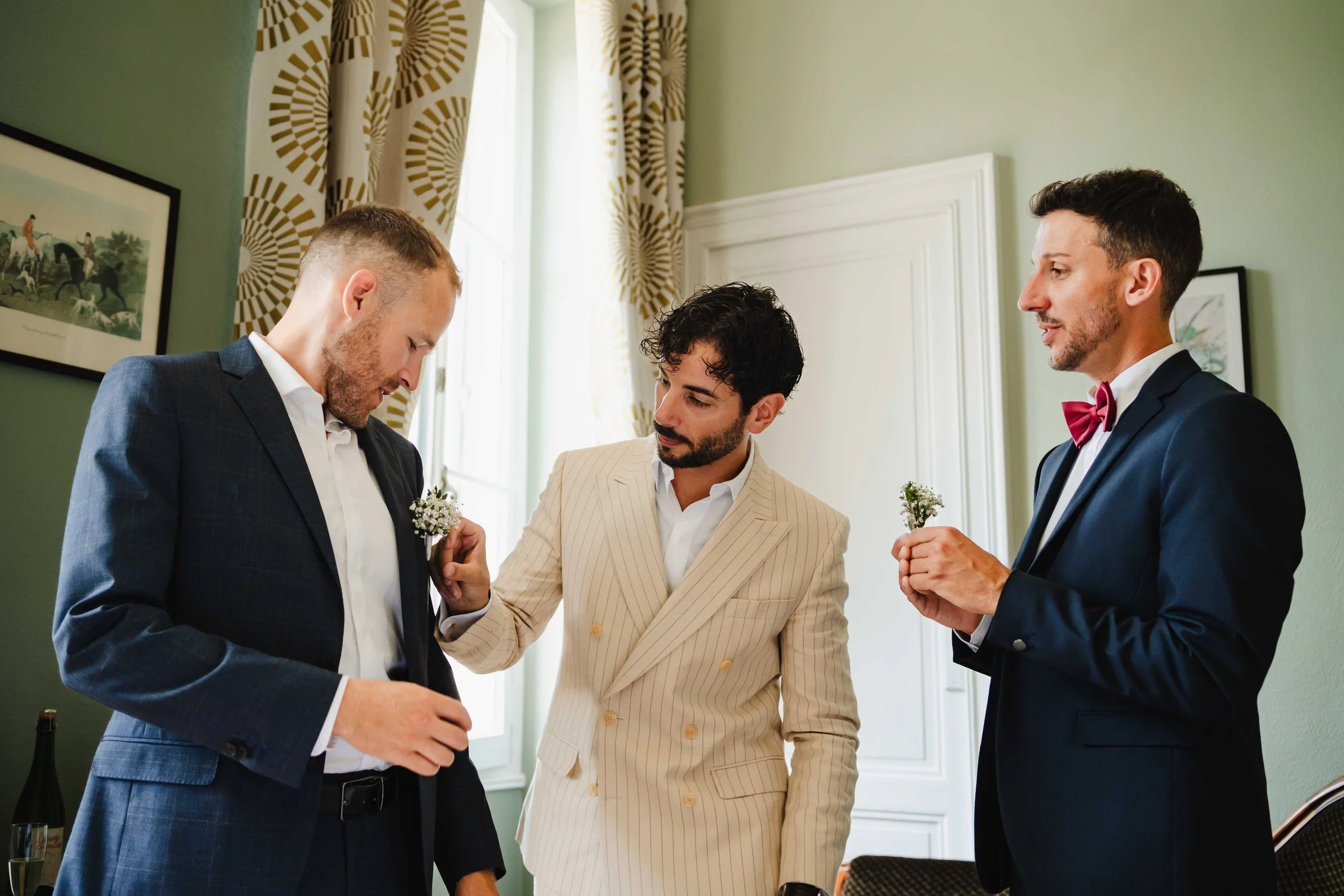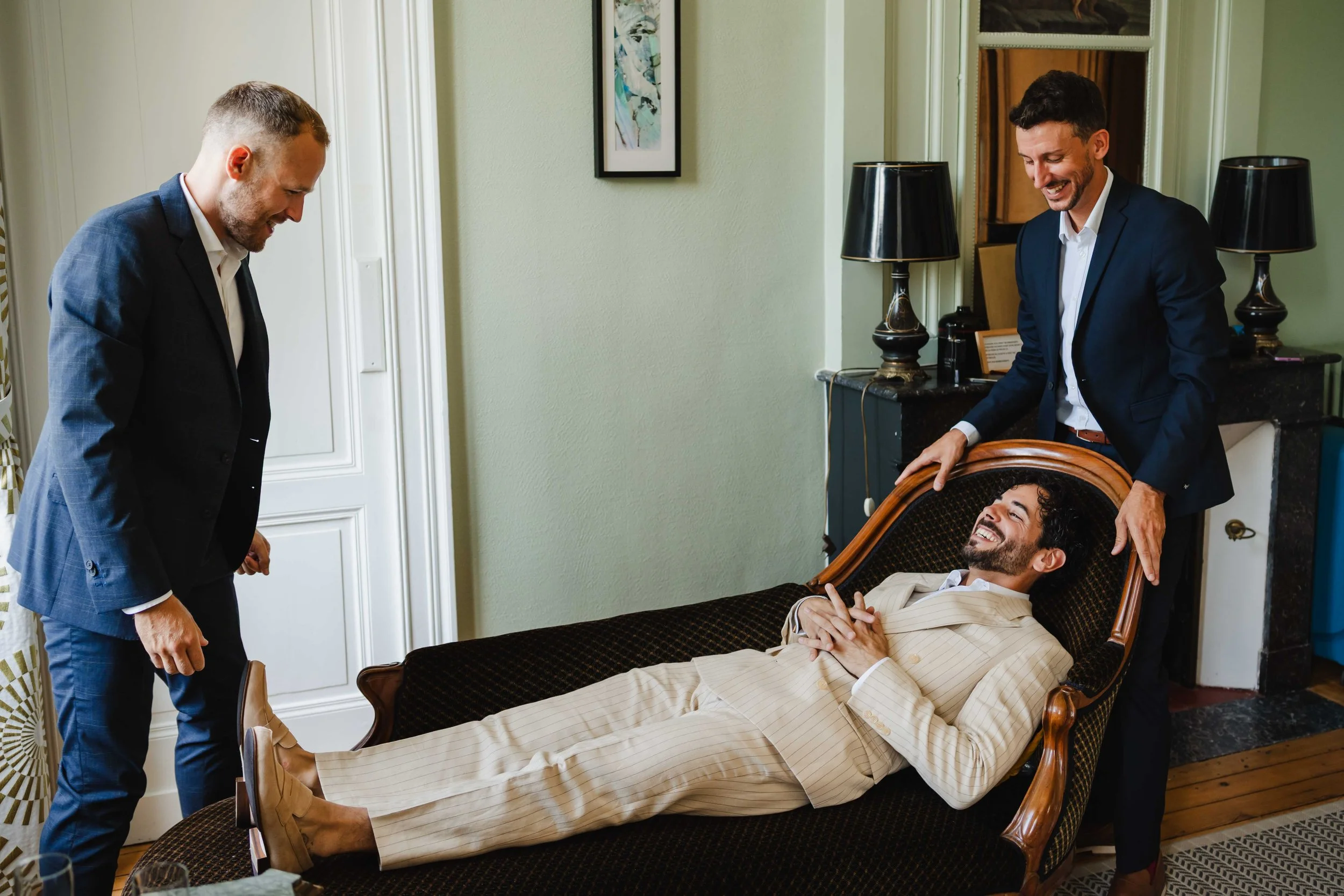 Il était alors temps d’aller voir Romuald et ses témoins, qui semblaient assez tranquilles, ces derniers prenant bien le temps de l’aider à s’habiller avant de déboucher le champagne pour des photos où ils trinquaient et se donnaient de la force avant d’affronter une grande journée. On profitait du beau sofa qui était dans la chambre pour faire quelques photos presque sérieuses de ce petit groupe d’amis.