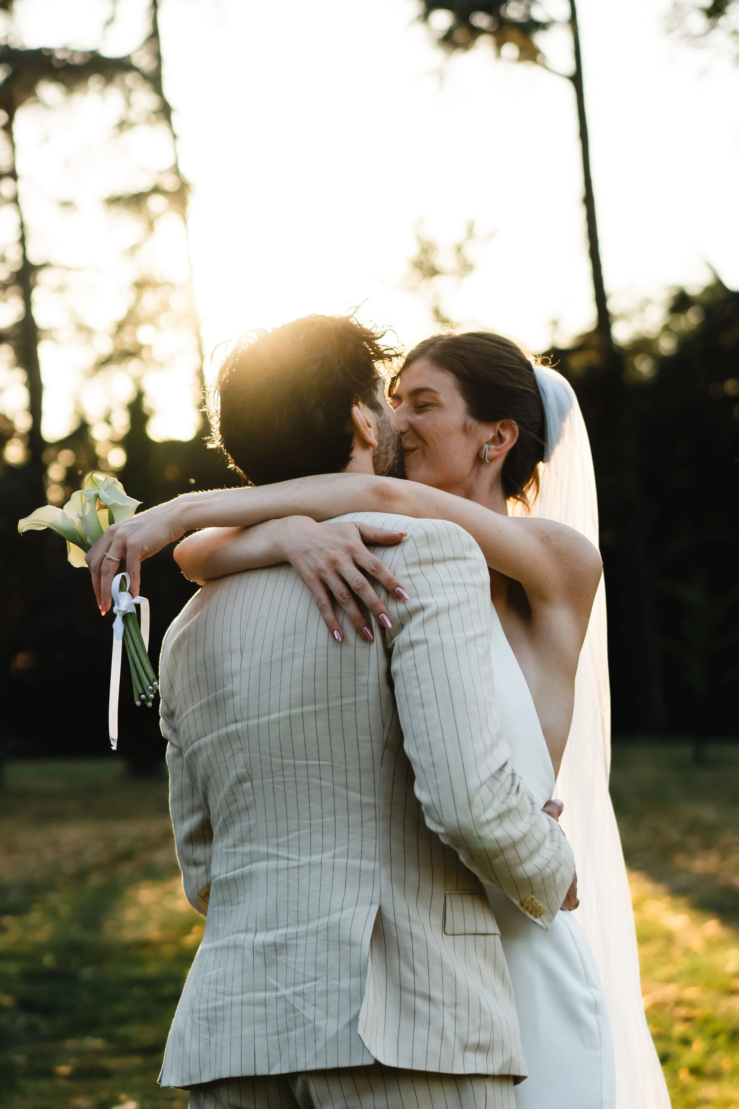 Le lancer de bouquet était ensuite orchestré avec de nombreuses prétendantes qui s’alignaient face au soleil pour essayer de recevoir le joli bouquet de calla de la mariée. L’heureuse élue était applaudie et embrassée par la mariée, après l’avoir prise en photo avec la mariée et ses amies, j’en profitais pour réaliser quelques portraits d’invités m’ayant demandé, le soleil couchant en arrière plan étant