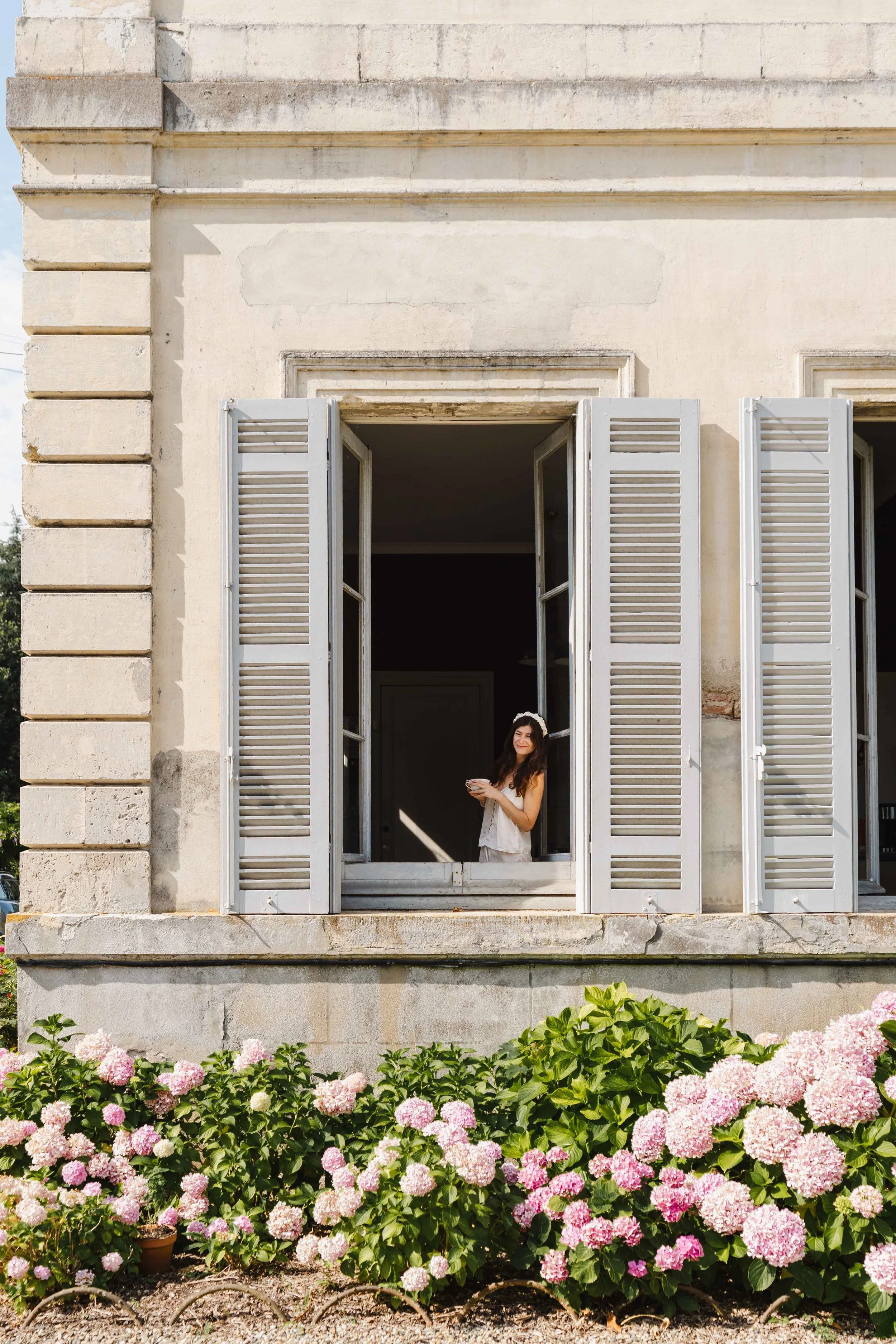 Il était alors temps de rejoindre Emilie et ses demoiselles d’honneur ainsi que sa famille, avant tout, nous étions obligés de commencer la préparation dans la cuisine du château, avec toutes les casseroles en cuivre accrochées au mur, et baignée de lumière le matin, elle sera un fond sublime pour des images qui resteront longtemps. Emilie n’avait plus qu’à s’asseoir sur la table avec ses Crocs de mariage épiques pour réaliser une image unique et tellement pleine de vie. J’en profitais également pour aller à l’extérieur afin de capturer la mariée dans un cadre superbe avec les hortensias roses qui coloraient le sol de la façade.